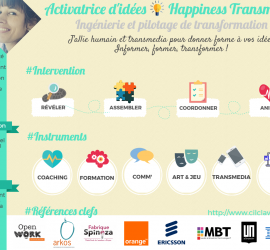 Je vous accompagne dans vos projets à dimension créative ou transformative, pour informer, former, transformer les pratiques et postures dans les organisations.